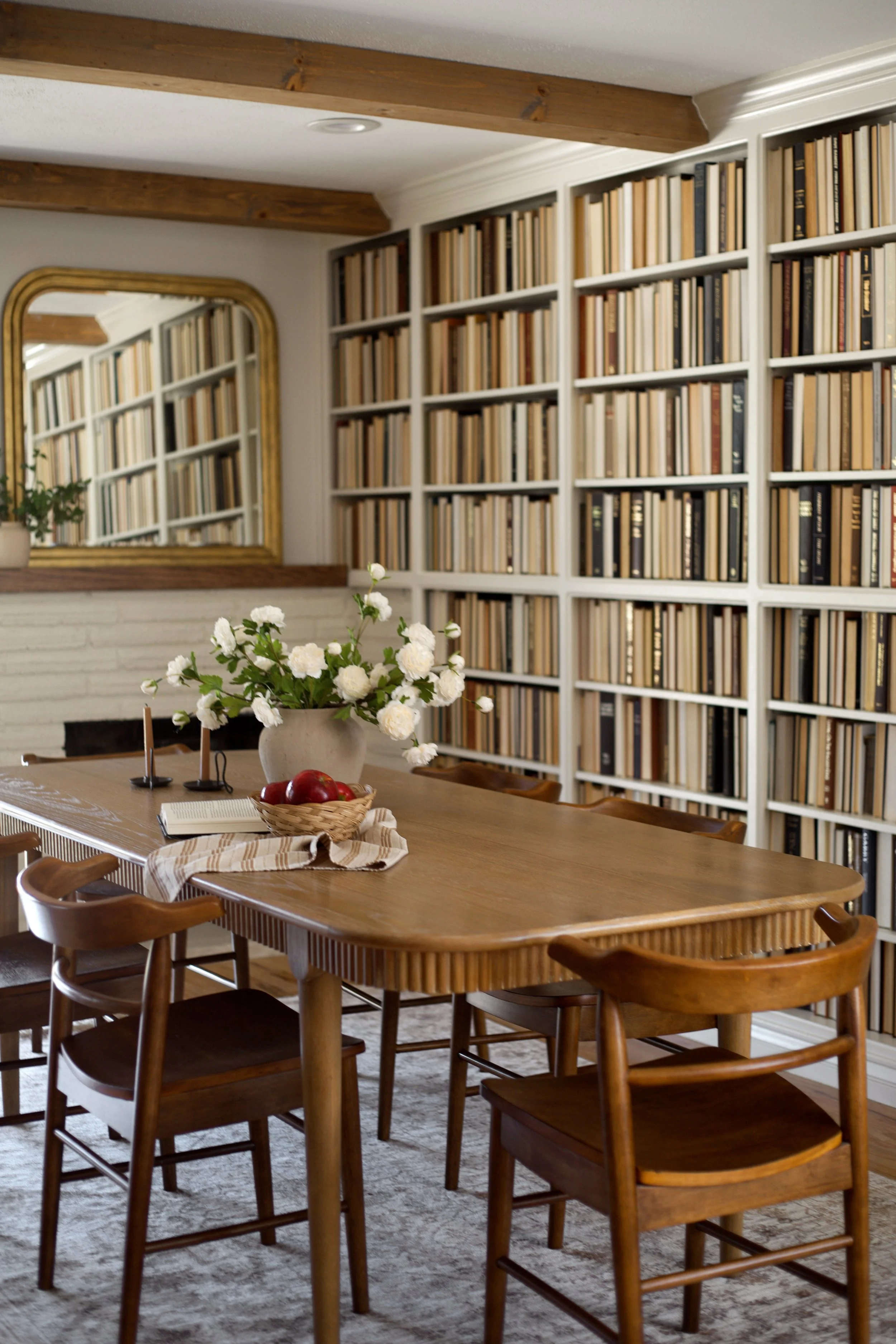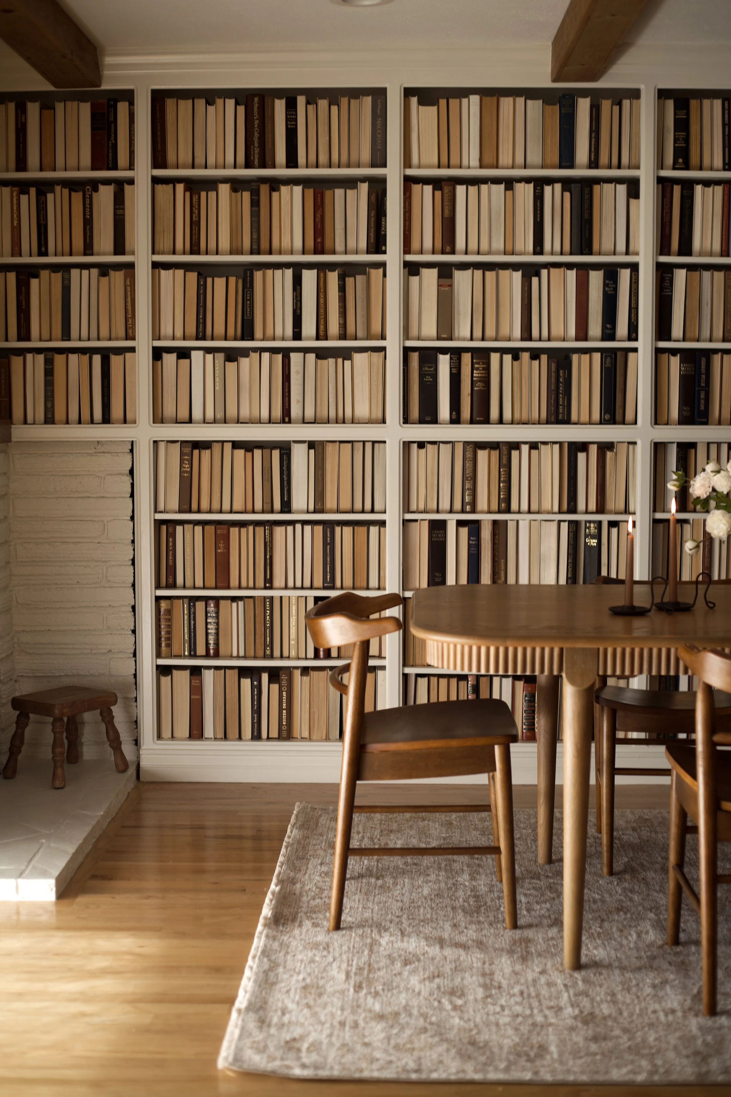 Not only did this room need a paint transformation, I needed to add a little more pizzazz to this space. I made multiple trips to our local bookstore and library and scored over 500 books to fill this beast of a built-in. Some took it hard that I turned the spines in but I love the look. It makes for the coziest dining room. Adding a rug under the table created much more depth to the area as well. It’s the simple decisions that make a space feel curated. That’s why layering with intention is important! The dining room turned out exactly how I envisioned it and all it needed was a coat of warm white paint.