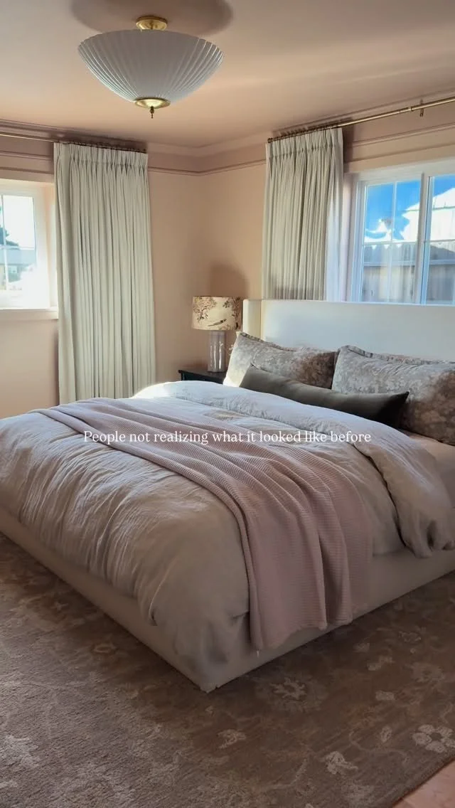 It was time for a major change in our primary bedroom. I’m talking a big glow-up. A room that feels sophisticated and romantic, if you will. I took about a month to this think over. I had a few furniture pieces in mind but wasn’t sure about the exact design. In November, I stumbled upon a gorgeous solid oak dresser on FBMP. I headed over to the estate sale and was able to snatch it for $300! It was a steal considering we found the same piece selling for over $1200 on the internet. Then it sat in our garage until we were ready to start this project. After finding this dresser and browsing Pinterest for inspo, it hit me that I should paint the room PINK. You heard it, PINK. I told Travis which color I wanted to use and thankfully, it didn’t take much to convince him. He supports pretty much all of my ideas. In January, once the holidays were over with and cabin fever started to build up, we finally pulled the trigger and moved out of our bedroom to start the project. Then it ended up being two months of minor demo, prep work, paint, and pulling the design together.
