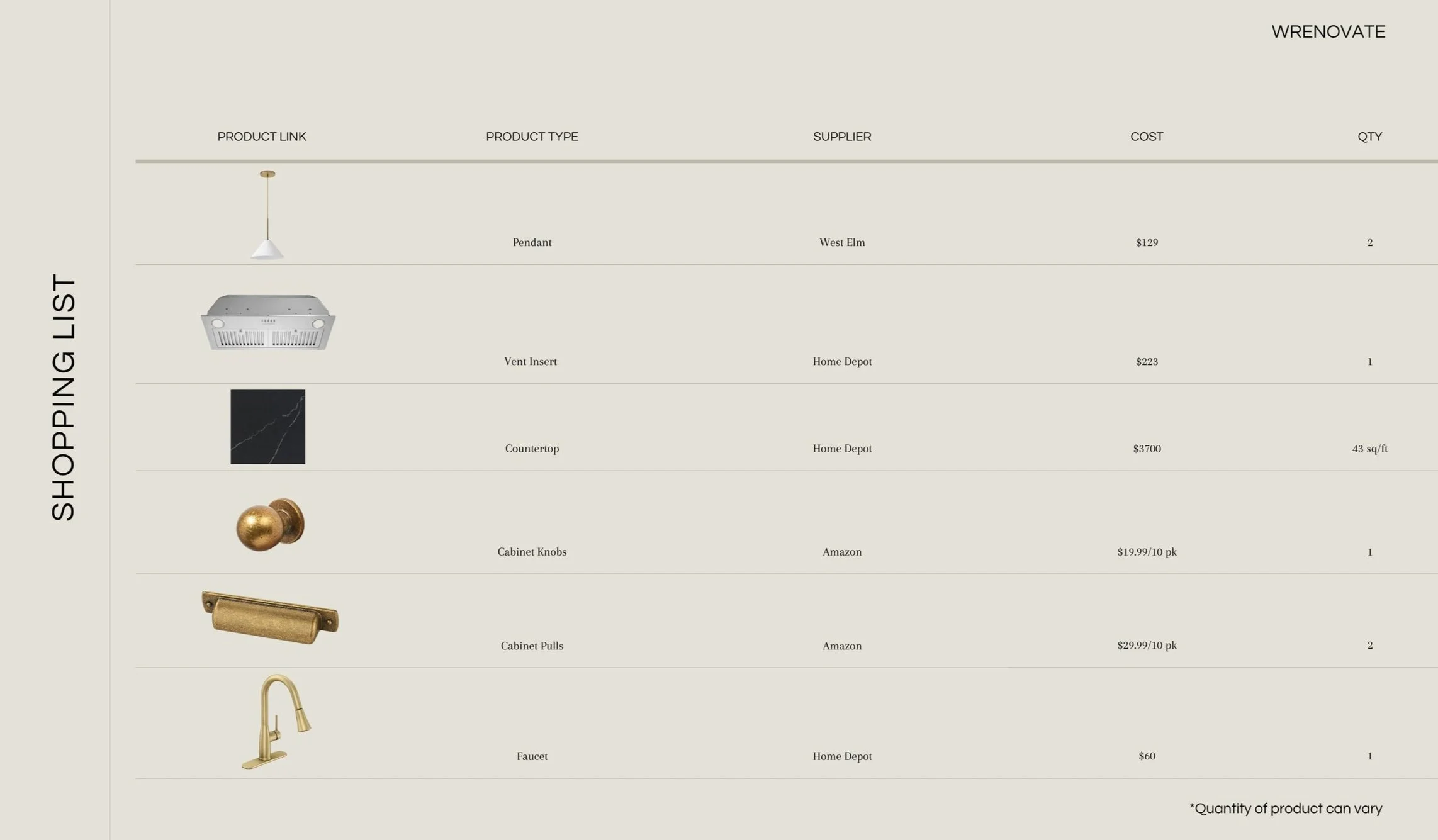 A shoppable list of materials used for the design. Each item is clickable which will direct you to the linked page.